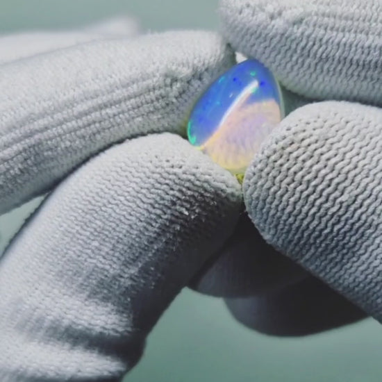 A beautiful Ethiopian opal with a translucent body and incredible flash. Bright green spark-like patterns and neon blue fire shift through its translucent body.