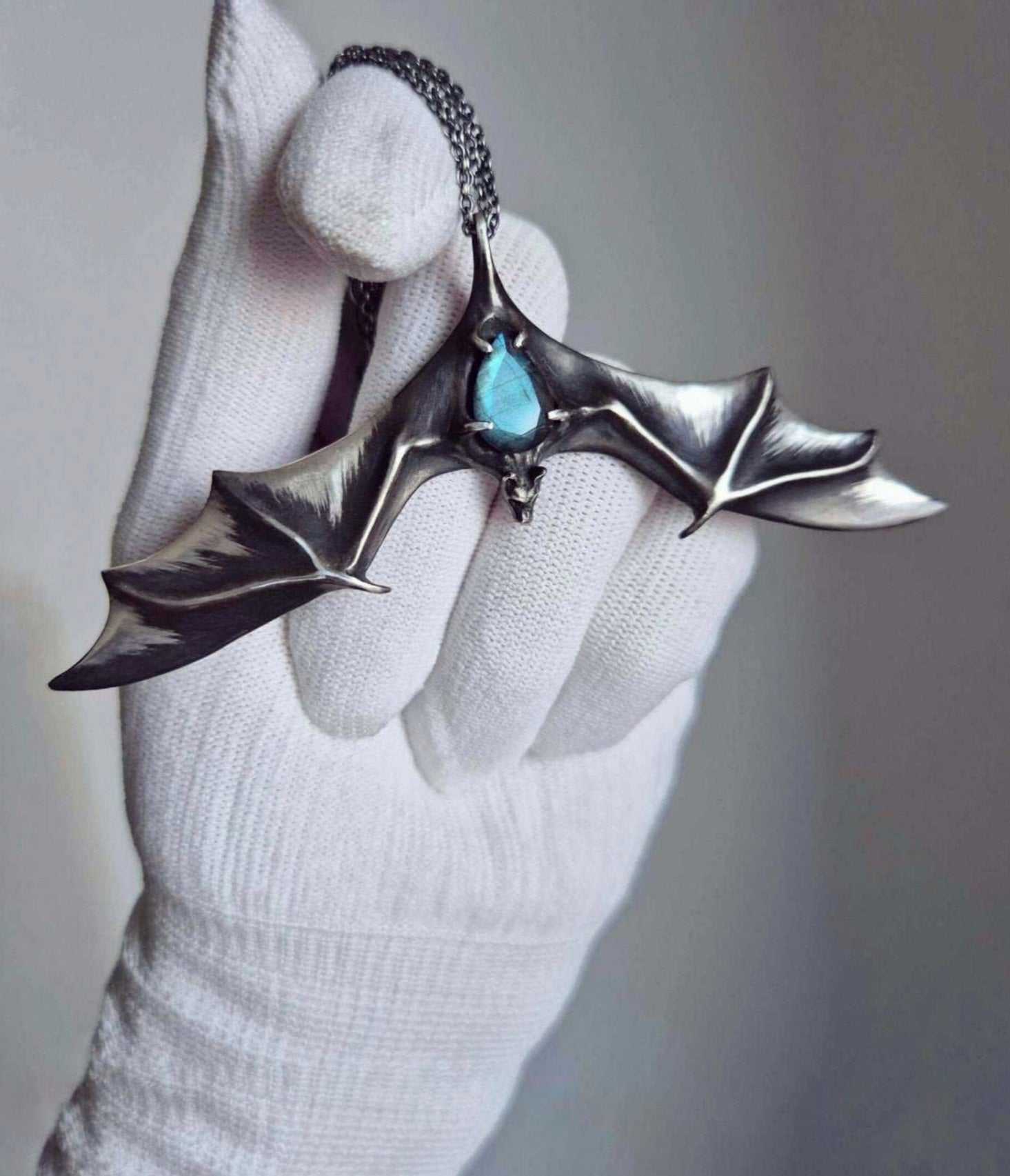 Striking and dramatic, this large silver Bat necklace is definitely a statement piece; its wide, sculpted wings convey a sense of motion, and the bright gem glows like a heartbeat.