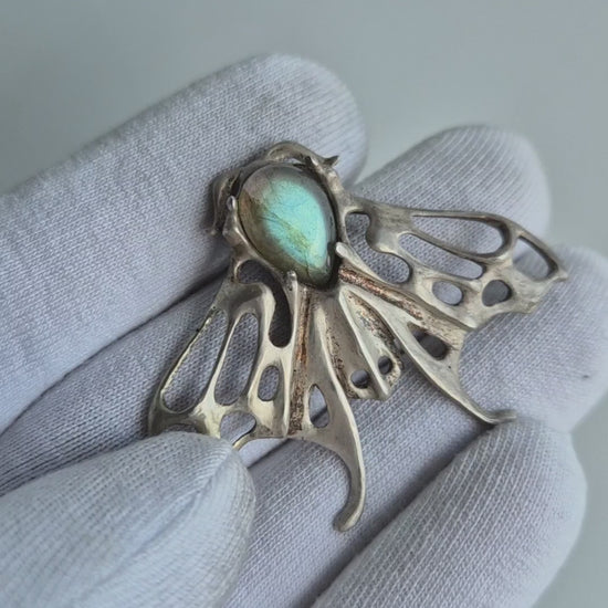This silver Moth necklace features a labradorite cabochon with a silvery/cyan flash. Please check the product video for the reference.