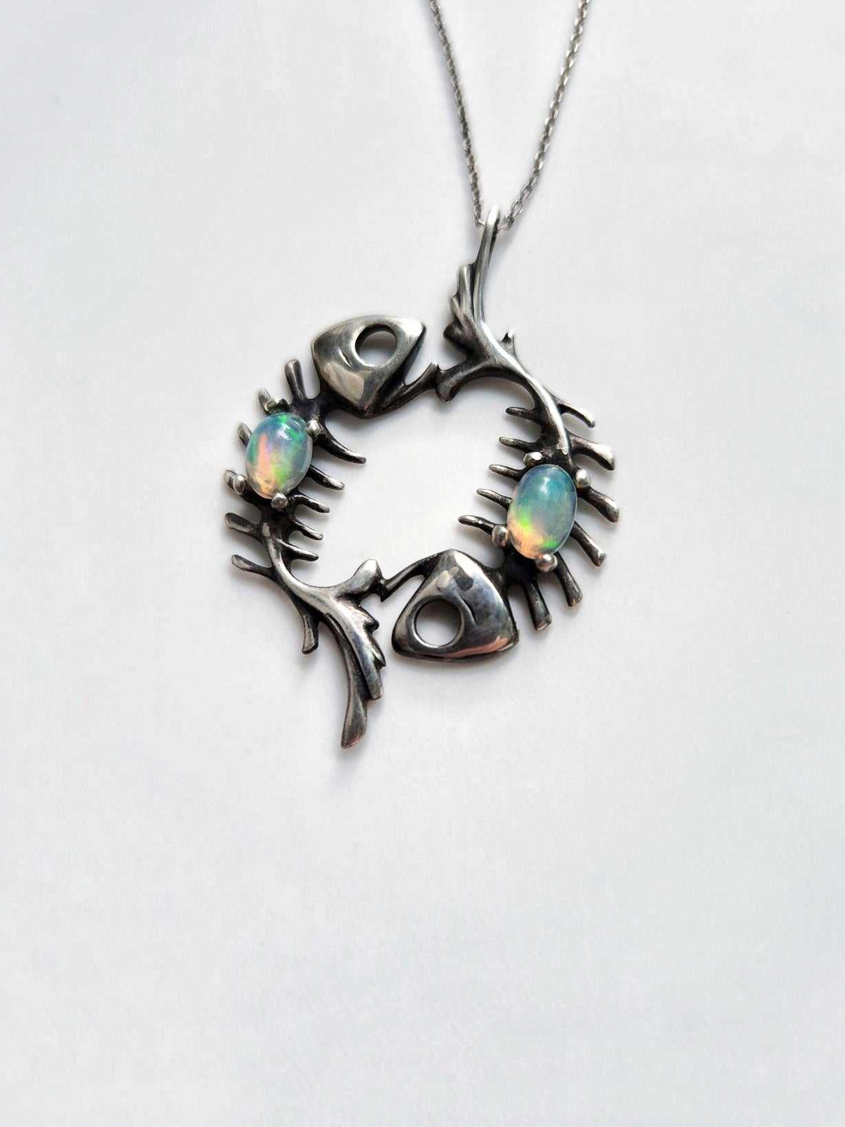 This silver Fish necklace features a pair of oval Ethiopian opal cabochons. Lovely translucent gems that show colors when catch light, - all natural gems are different, but I will pick a lovely pair for you.