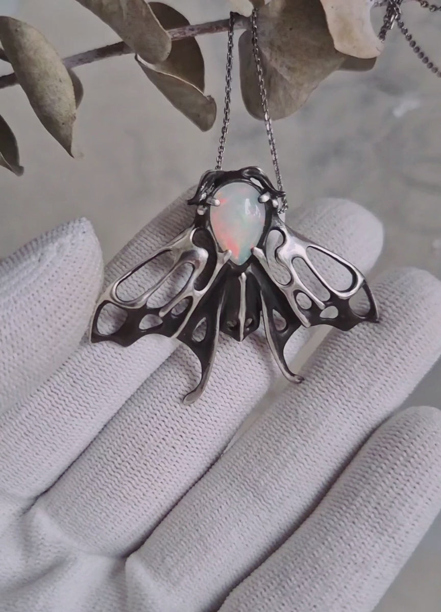 Moth Necklace – Natural Opal gem - Handmade symbolic silver jewelry