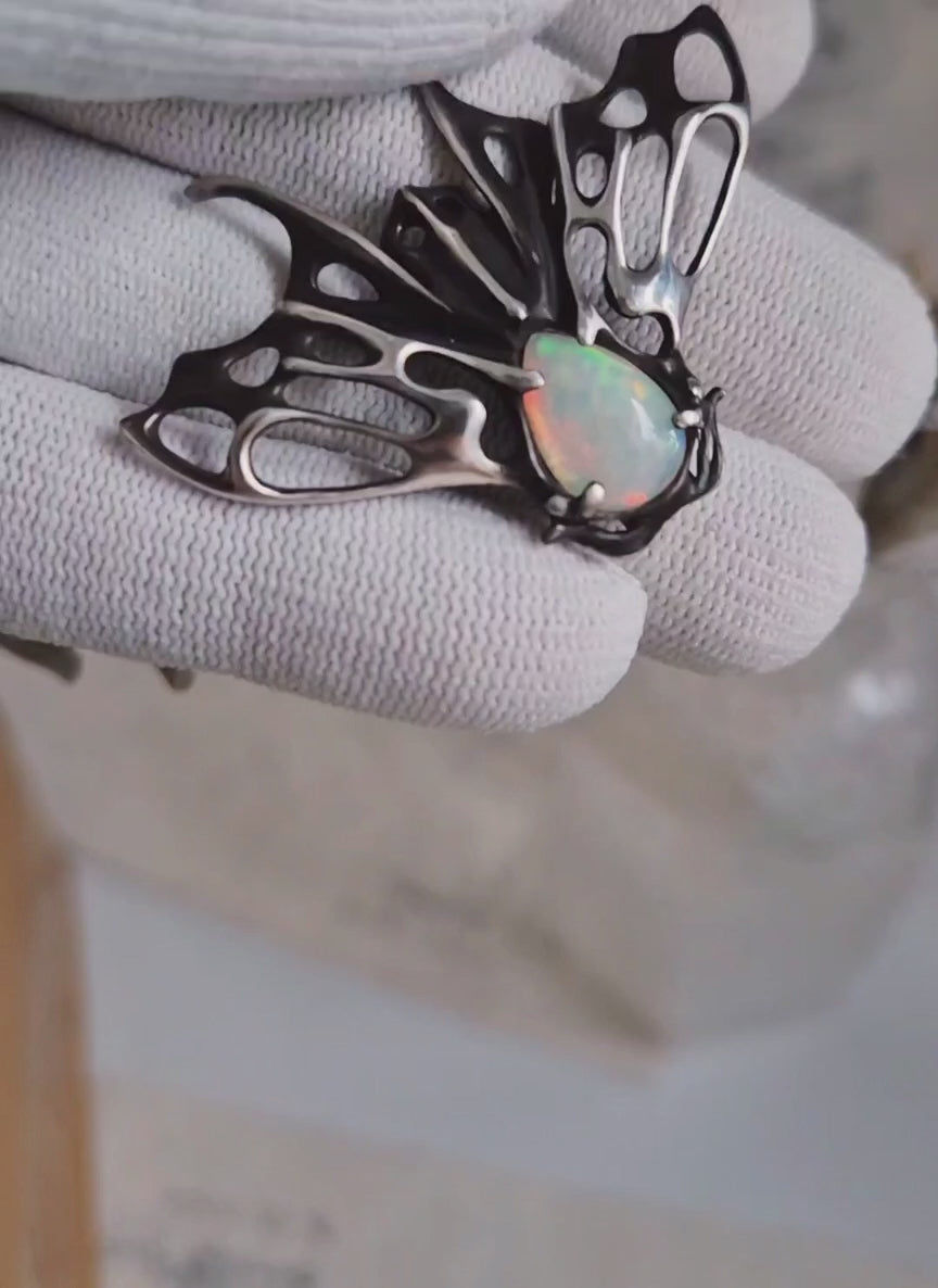 This silver Moth necklace features a natural opal cabochon with multicolor fire.