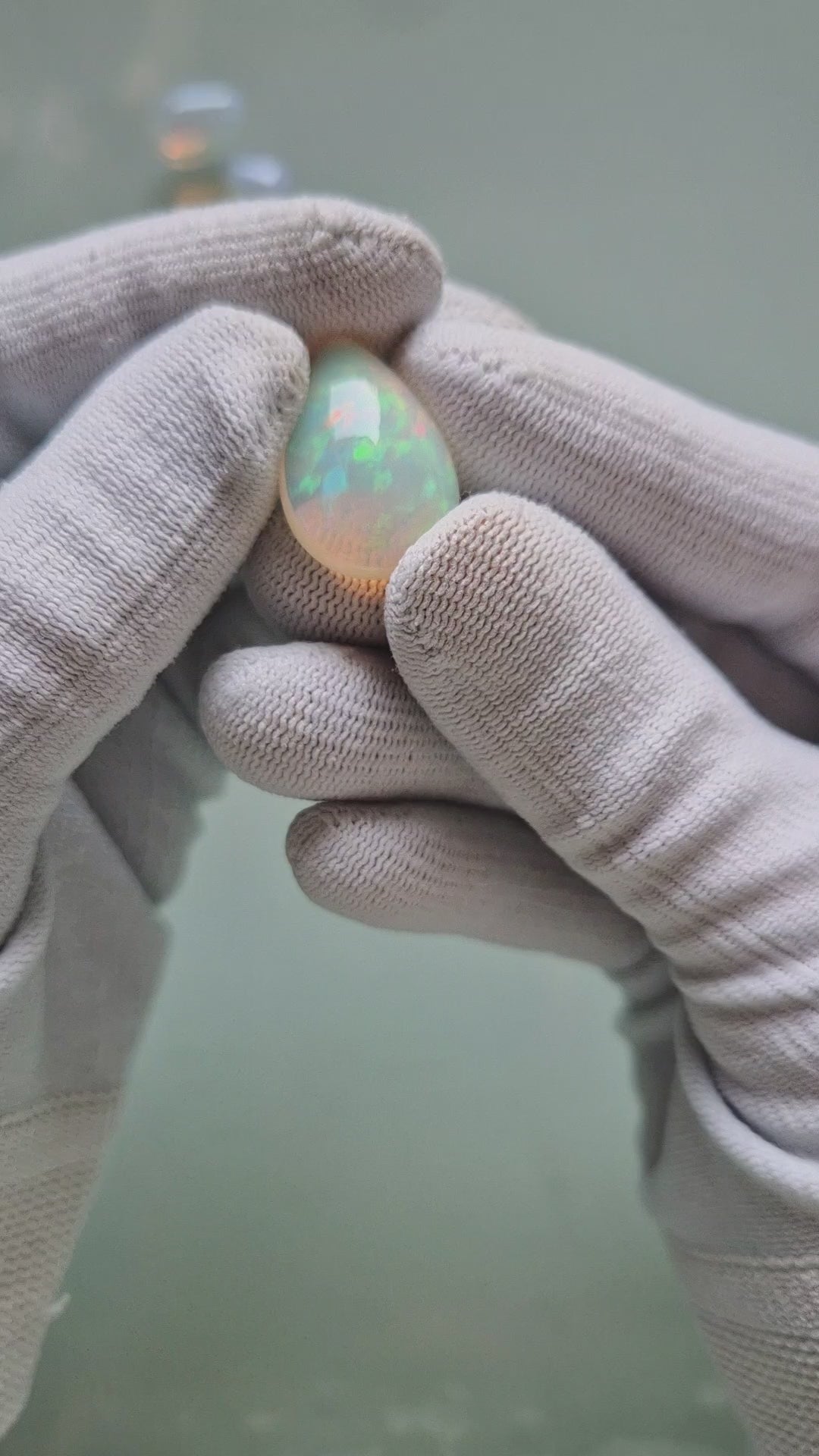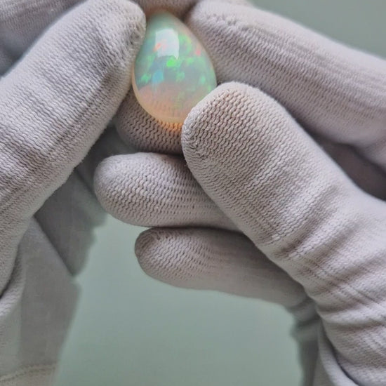 A delicate Ethiopian opal with a beautiful veil of green and pink colour that shifts through its half-translucent body.