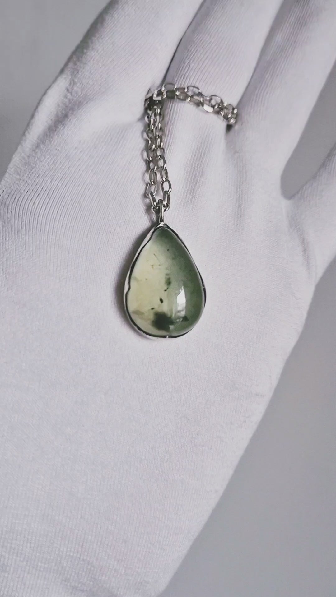 The prehnite pendant measures approx. 25 mm / 1 inch in length. The chain is 50 cm / 19.7 inches and can be worn at any shorter length.