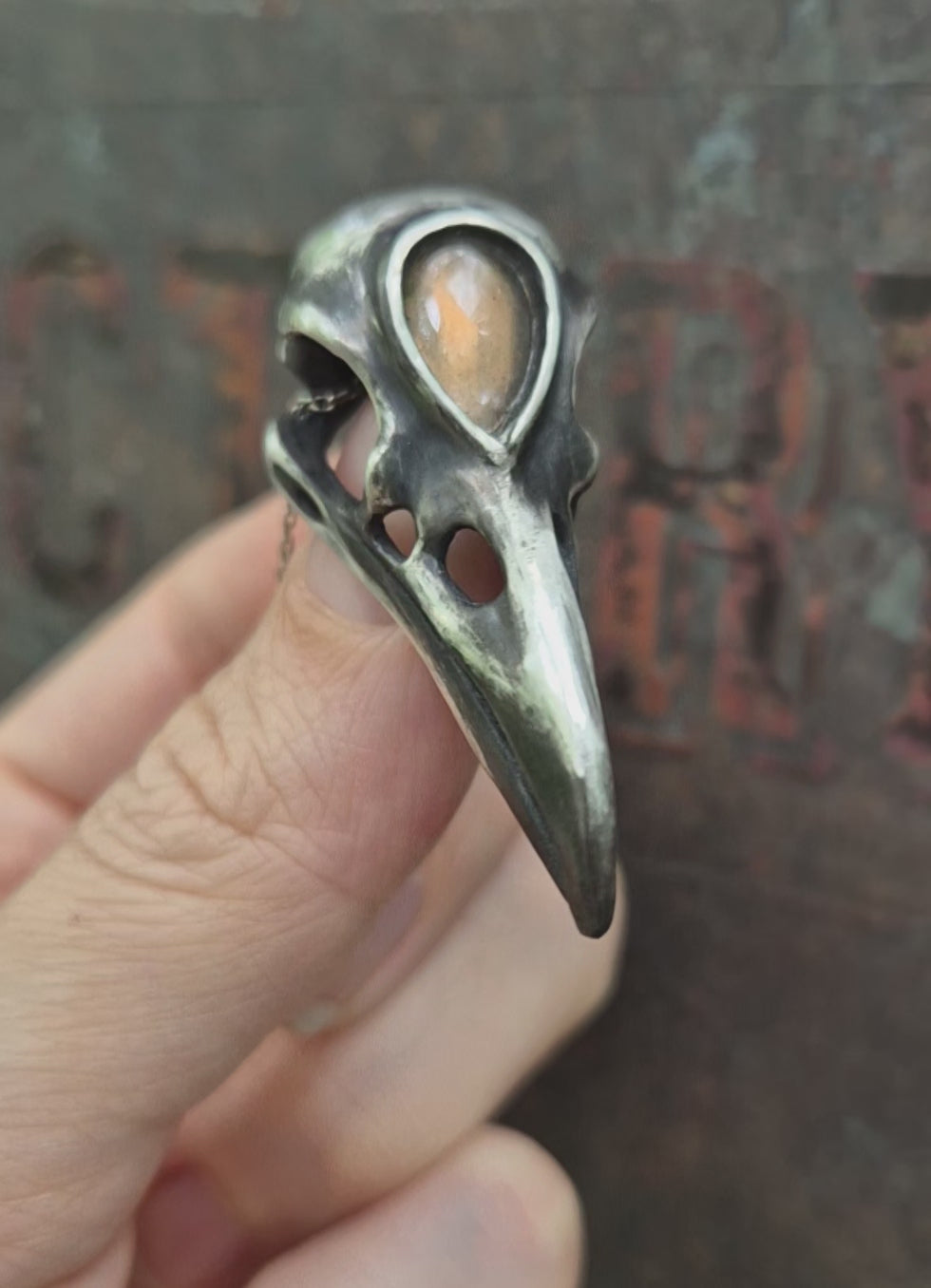 This silver Three-eyed Raven Skull necklace is a handcrafted talisman — sculptural, symbolic, and charged with quiet power. A golden labradorite cabochon is set in the forehead like a third eye, catching the light with shifting fire. The form is slightly raw to the touch, echoing bone, flight, and vision.