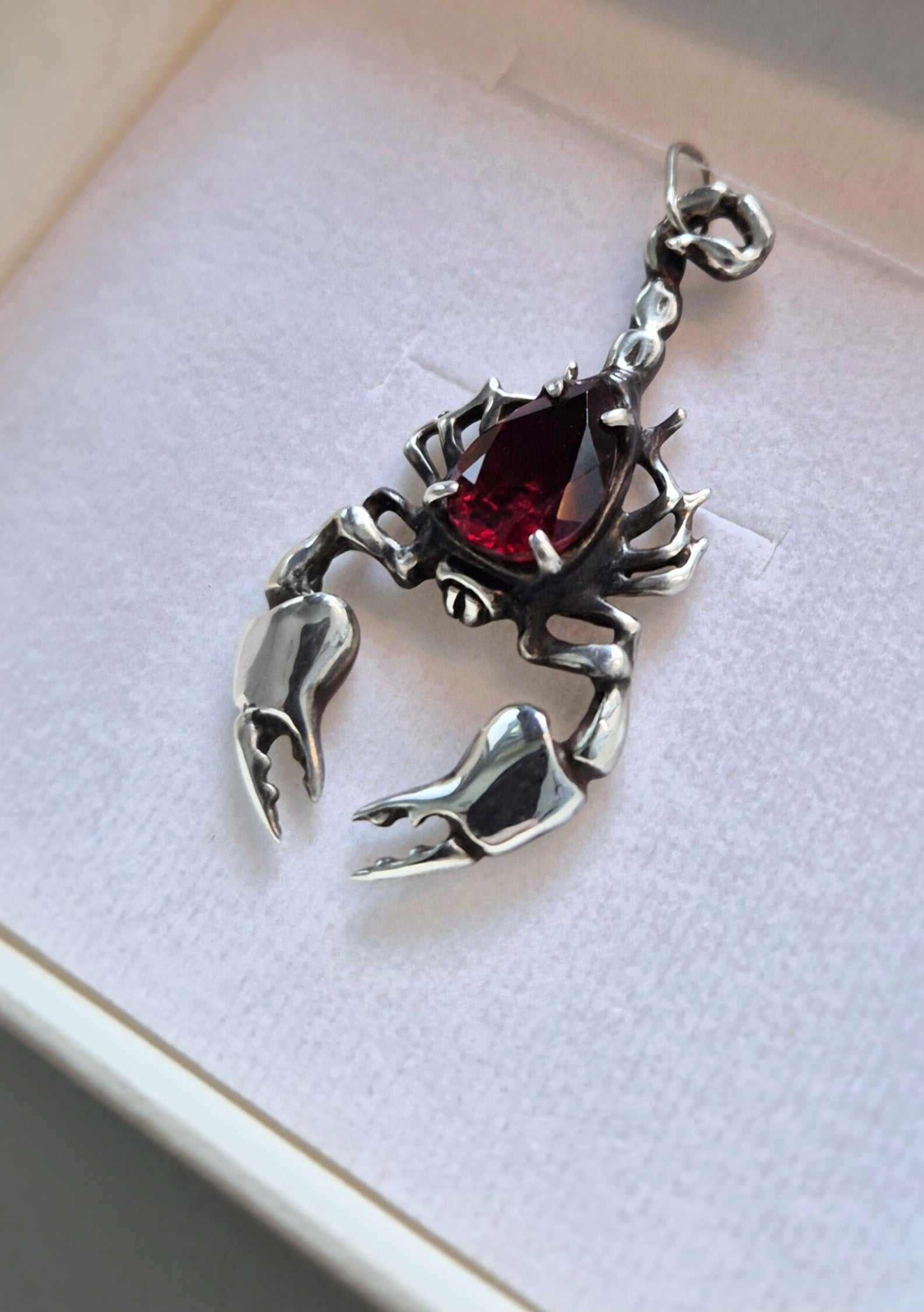 This silver Scorpion necklace fatures a beautiful faceted garnet with a deep wine-red fire glowing within. A truly elegant and captivating gemstone.