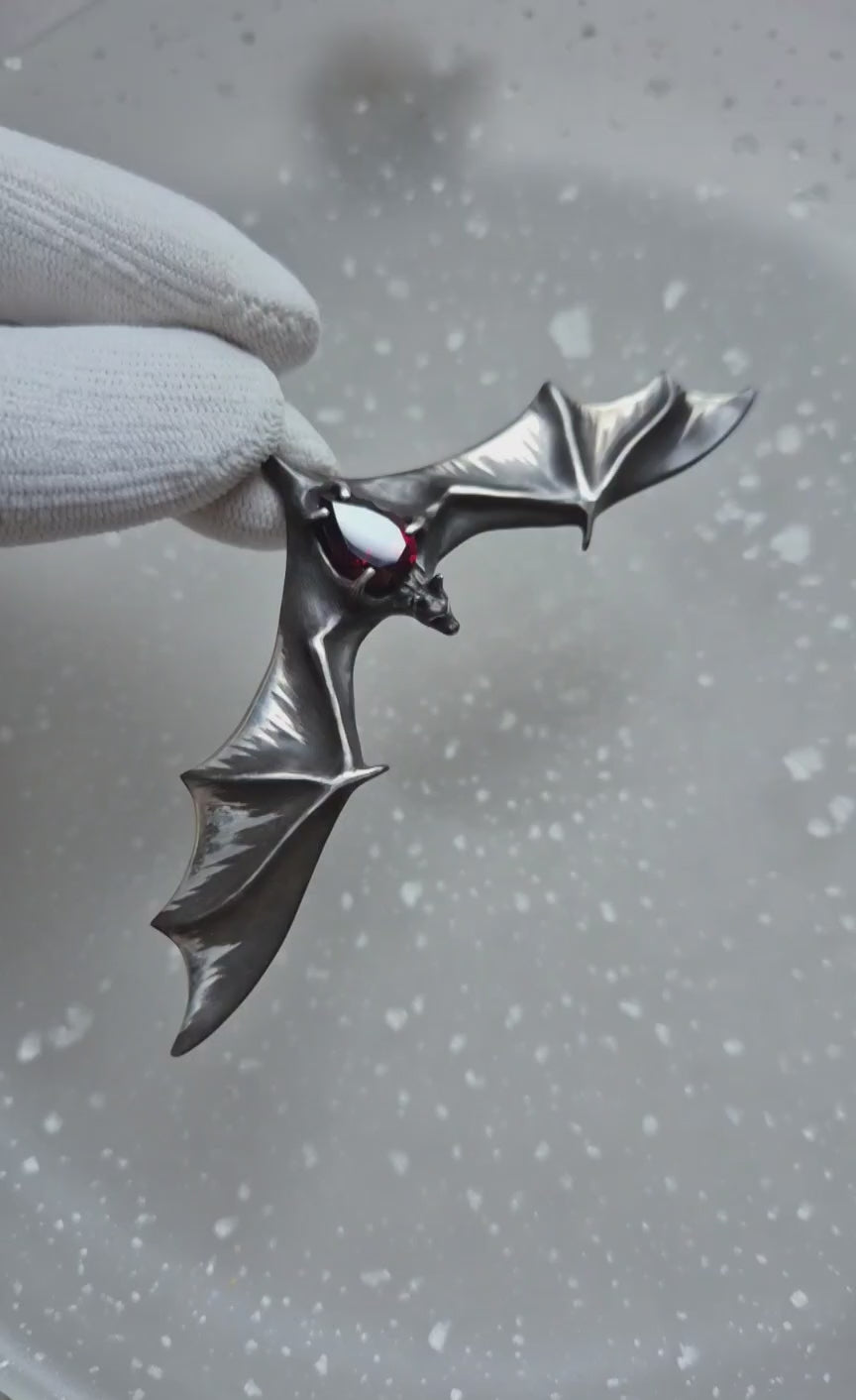 This silver Bat necklace features a natural faceted Mozambique garnet. These stones appear nearly black, but reveals a vivid red glow when it catches the light.