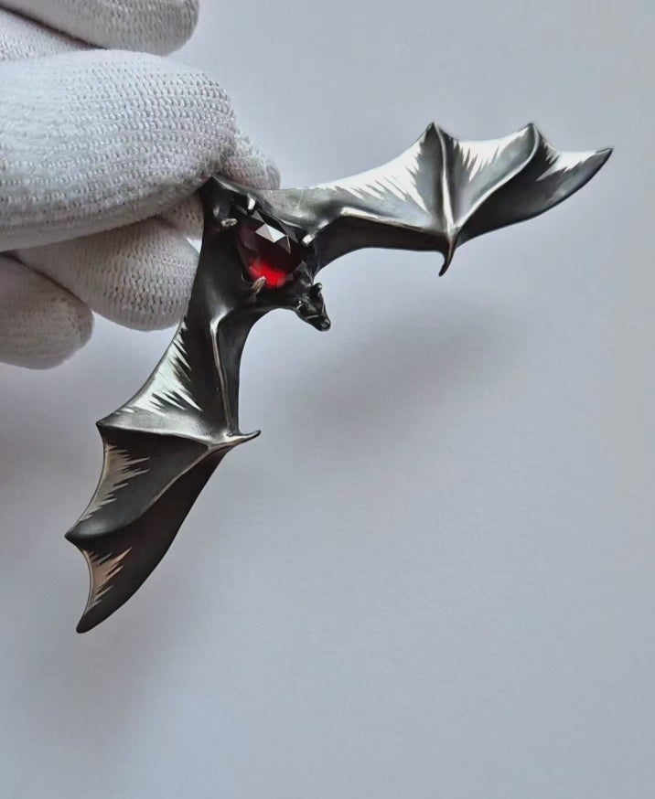 Its wide, sculpted wings convey a sense of motion, while the deep red garnet glows like a heartbeat — adding intensity to the bold, nocturnal silhouette.