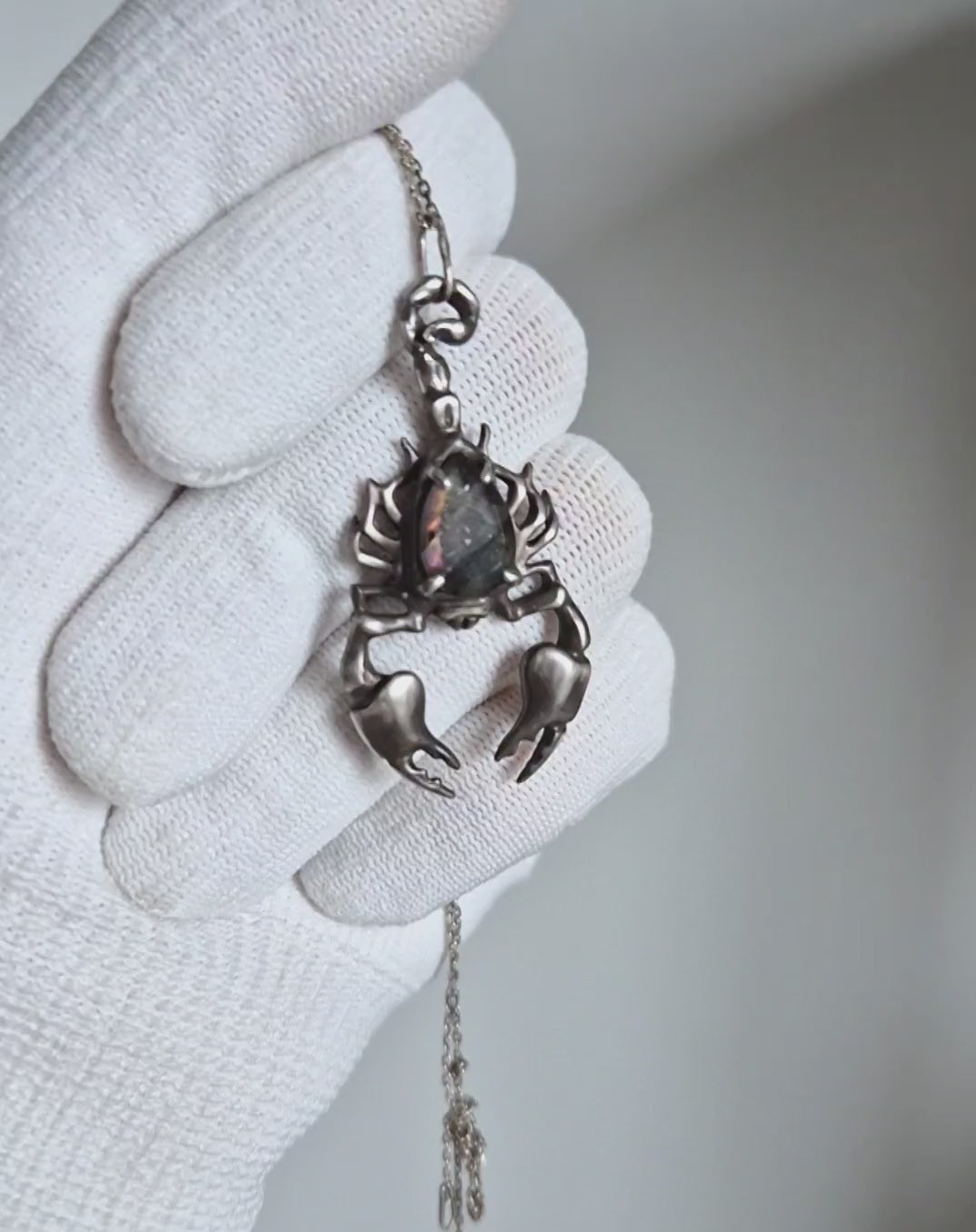 This silver Scorpion necklace features a faceted labradorite with a distinctive multicolor flash — its body is dark grey and reveals a hidden pattern when the light hits it at the right angle. The piece is both dark and bright at the same time!