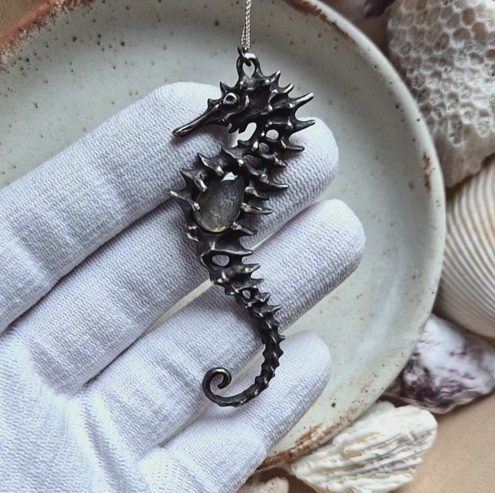 Its whimsical shape captures the gentle movement of a seahorse drifting through shallow waters. The ridged surface adds a tactile depth, as if the piece has been formed by tide and time. A shimmering labradorite glows at its center, like light caught beneath the waves — a wearable relic of the sea.