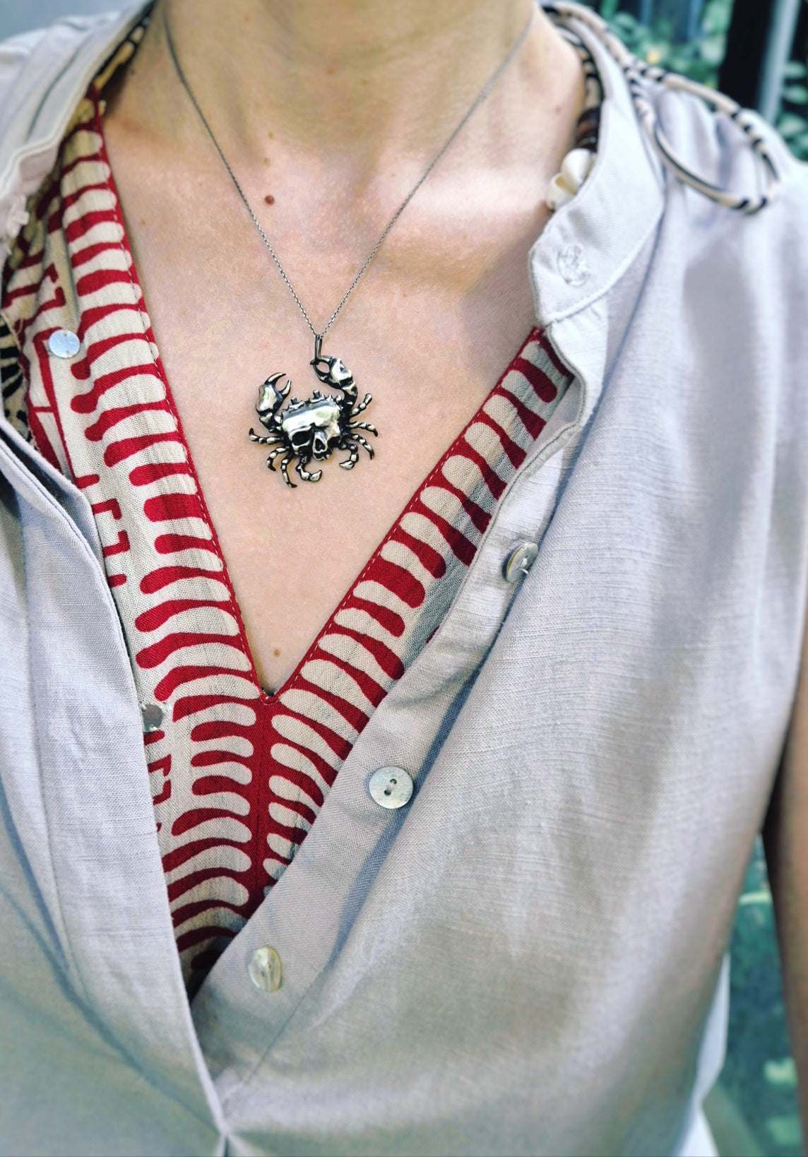 Silver Skull necklace - a Crab necklace with a sculpted skull at its core — a quiet meditation on the fusion of human and more-than-human, life and decay, sea and self. A weighty talisman with tactile texture that invites touch. This silver Skull necklace can become an unconventional zodiac gift.