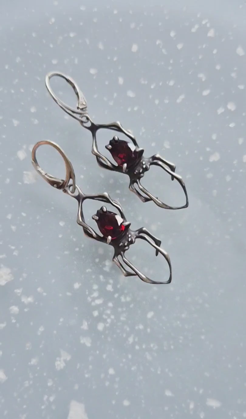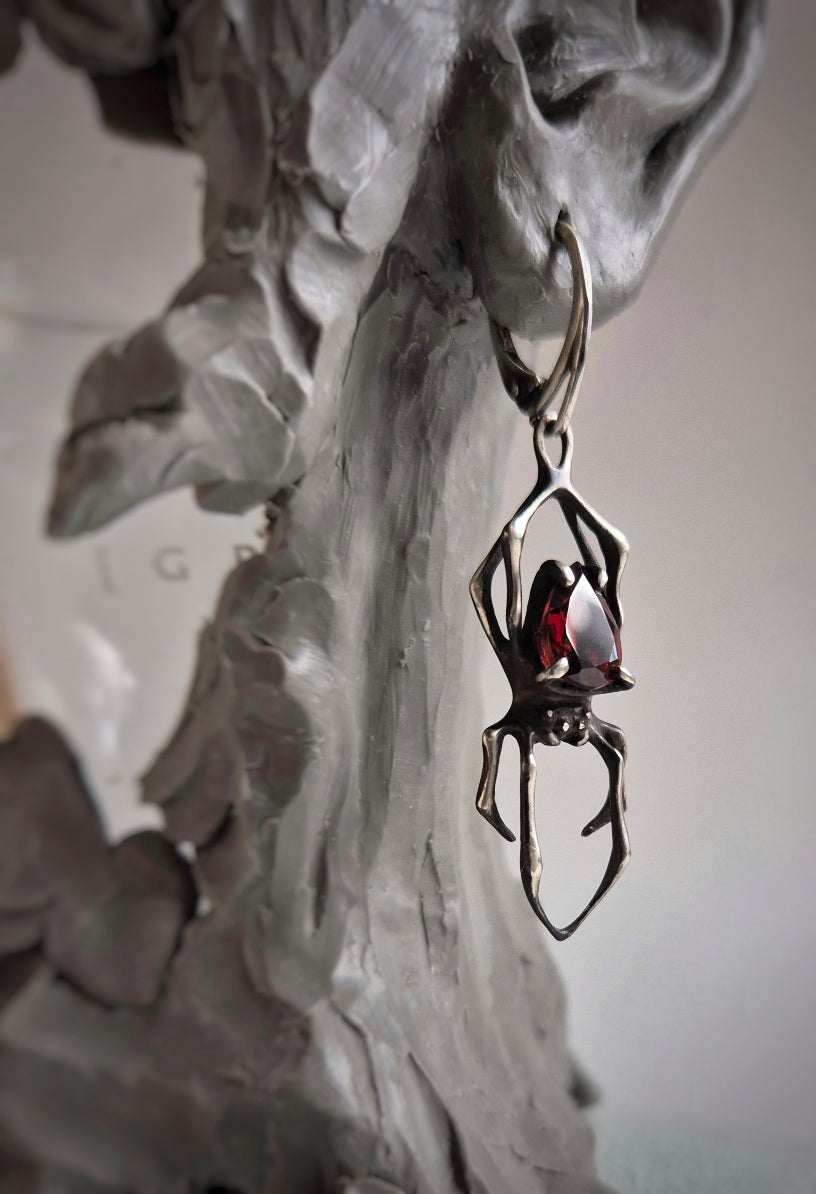 Spider earrings in Sterling silver - Garnet gem - Custom crafted