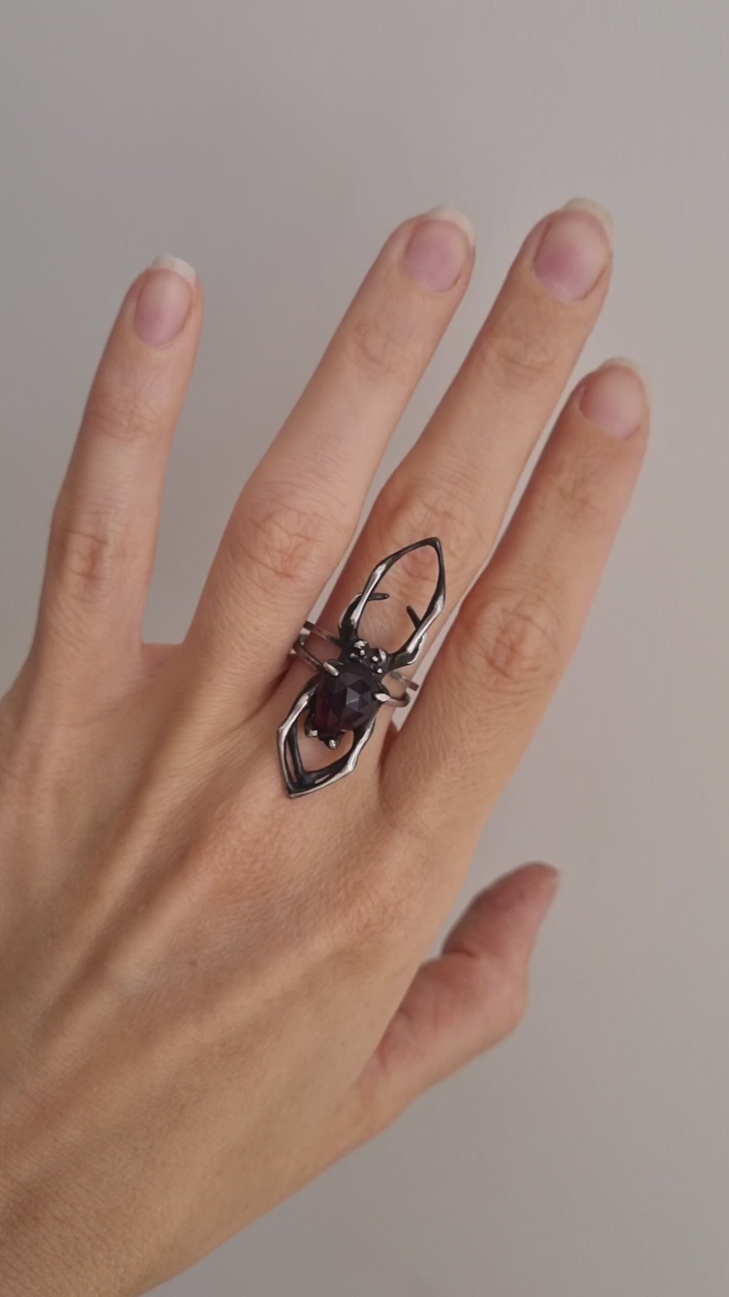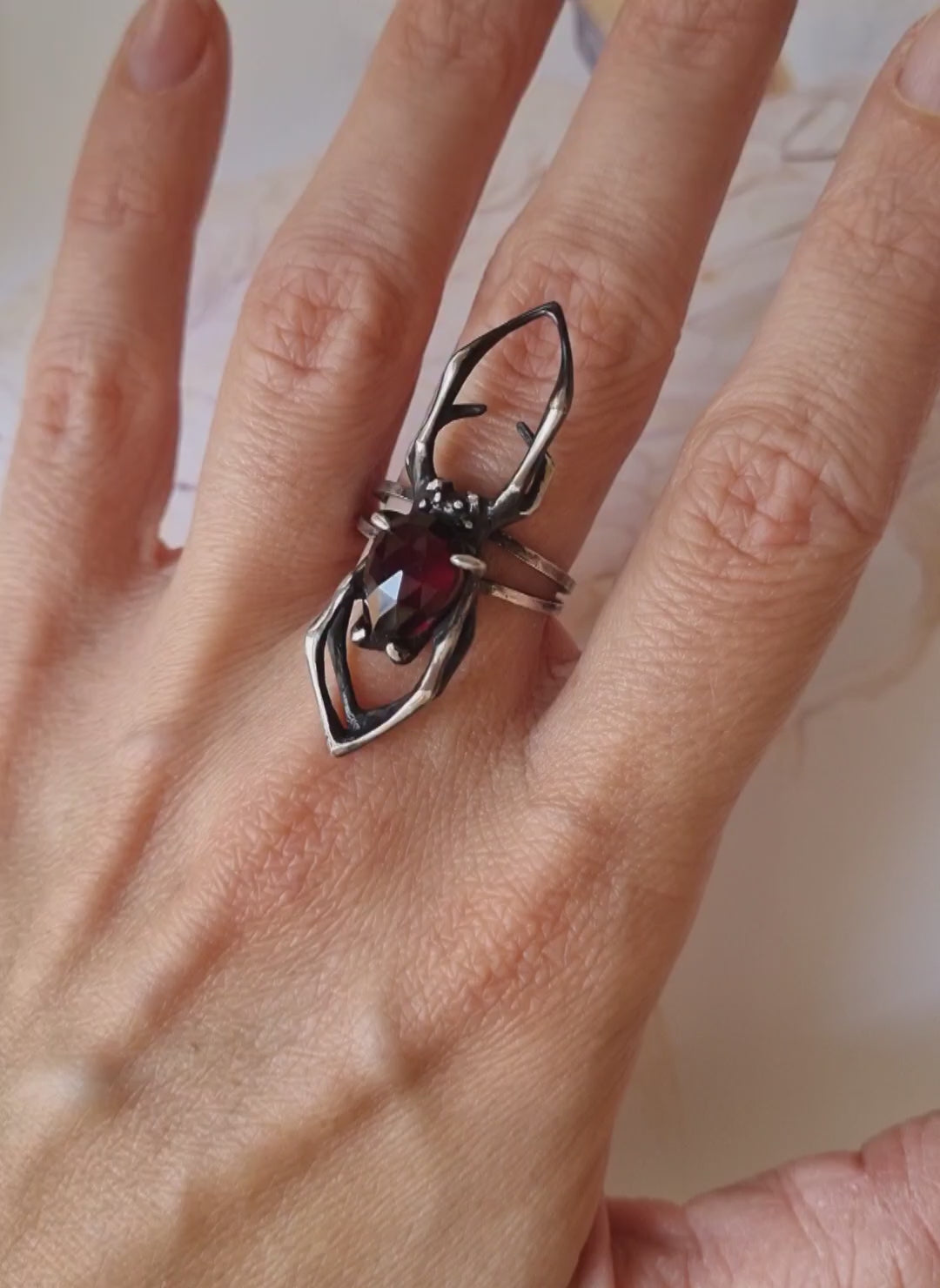 This silver Spider ring features a natural rose-cut garnet — a deep cherry-red stone that appears almost black in the shadows but reveals a rich wine-red glow in the light.
