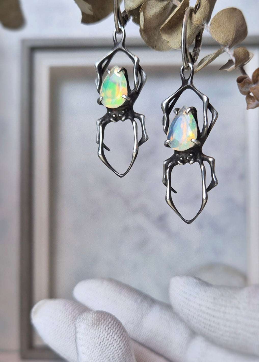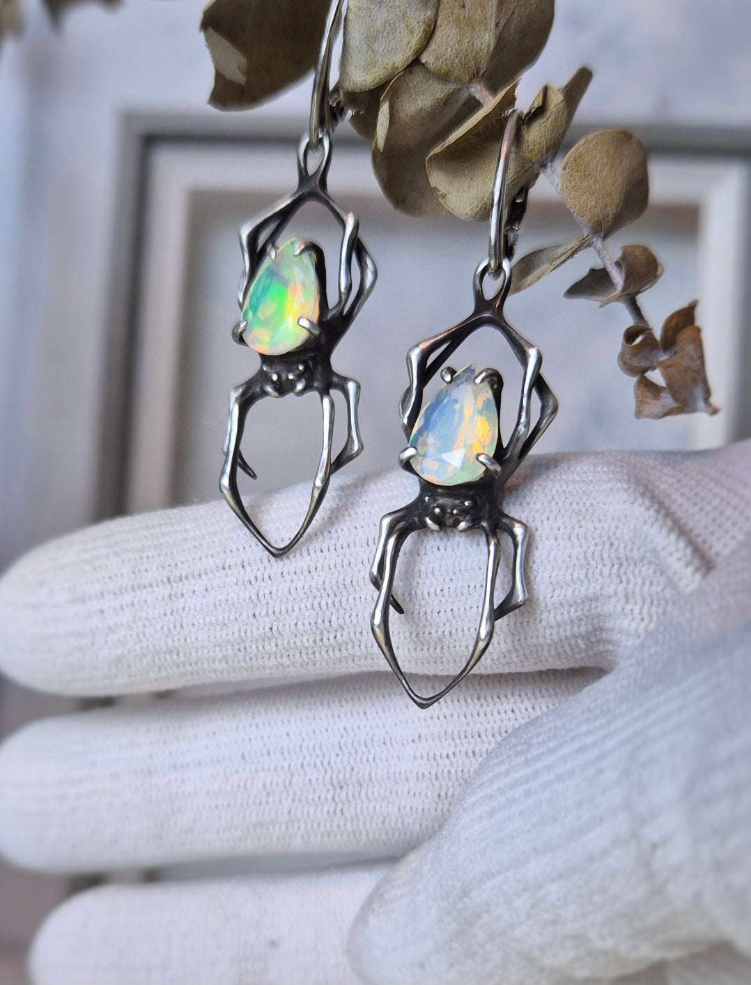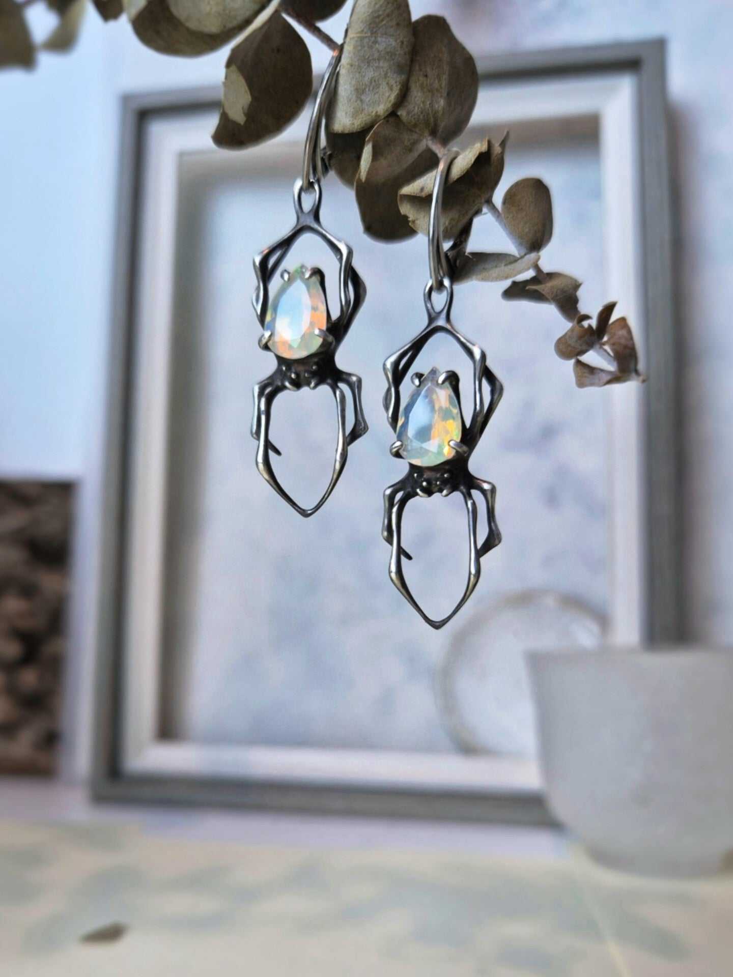 These silver Spider earrings feature natural opals — luminous stones with an foggy white base and flickers of inner fire, glowing with subtle rainbow tones. Natural gemstones vary in shade, but I will select a beautiful gem pair for you - nice and shiny!