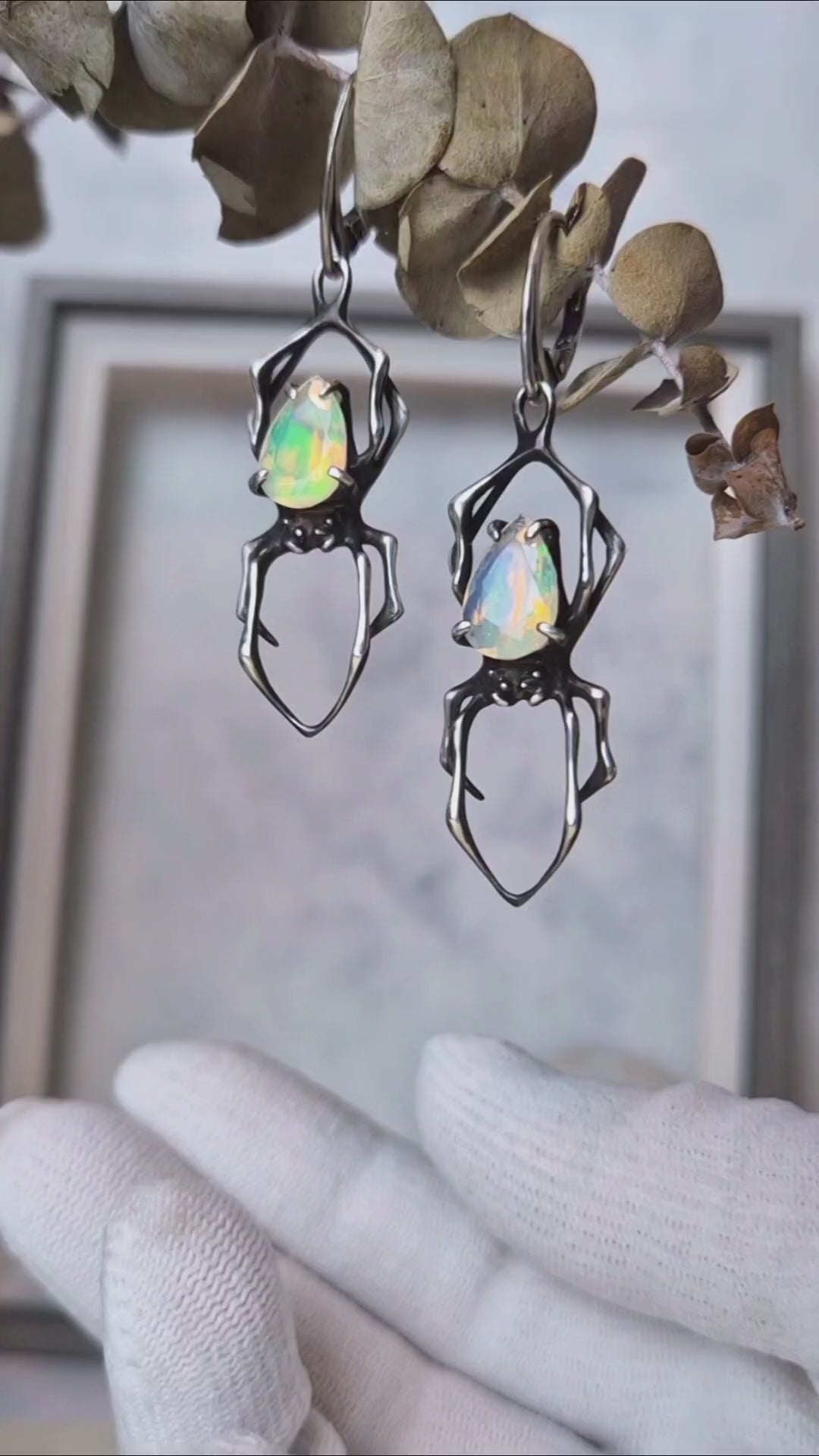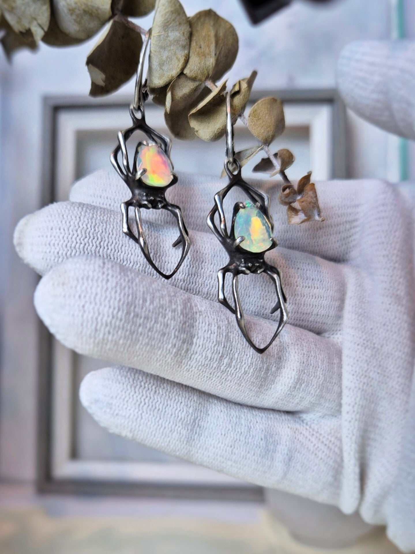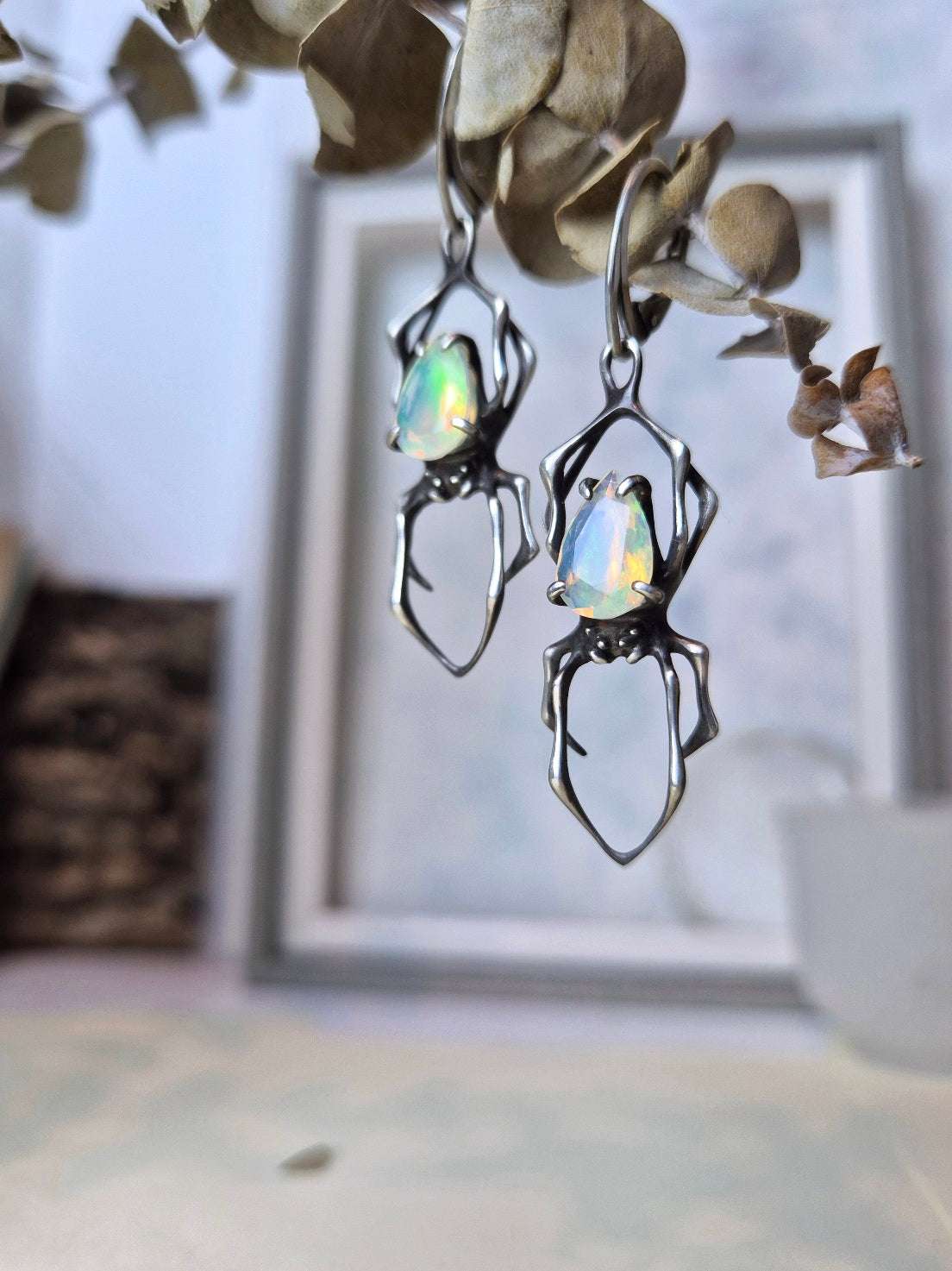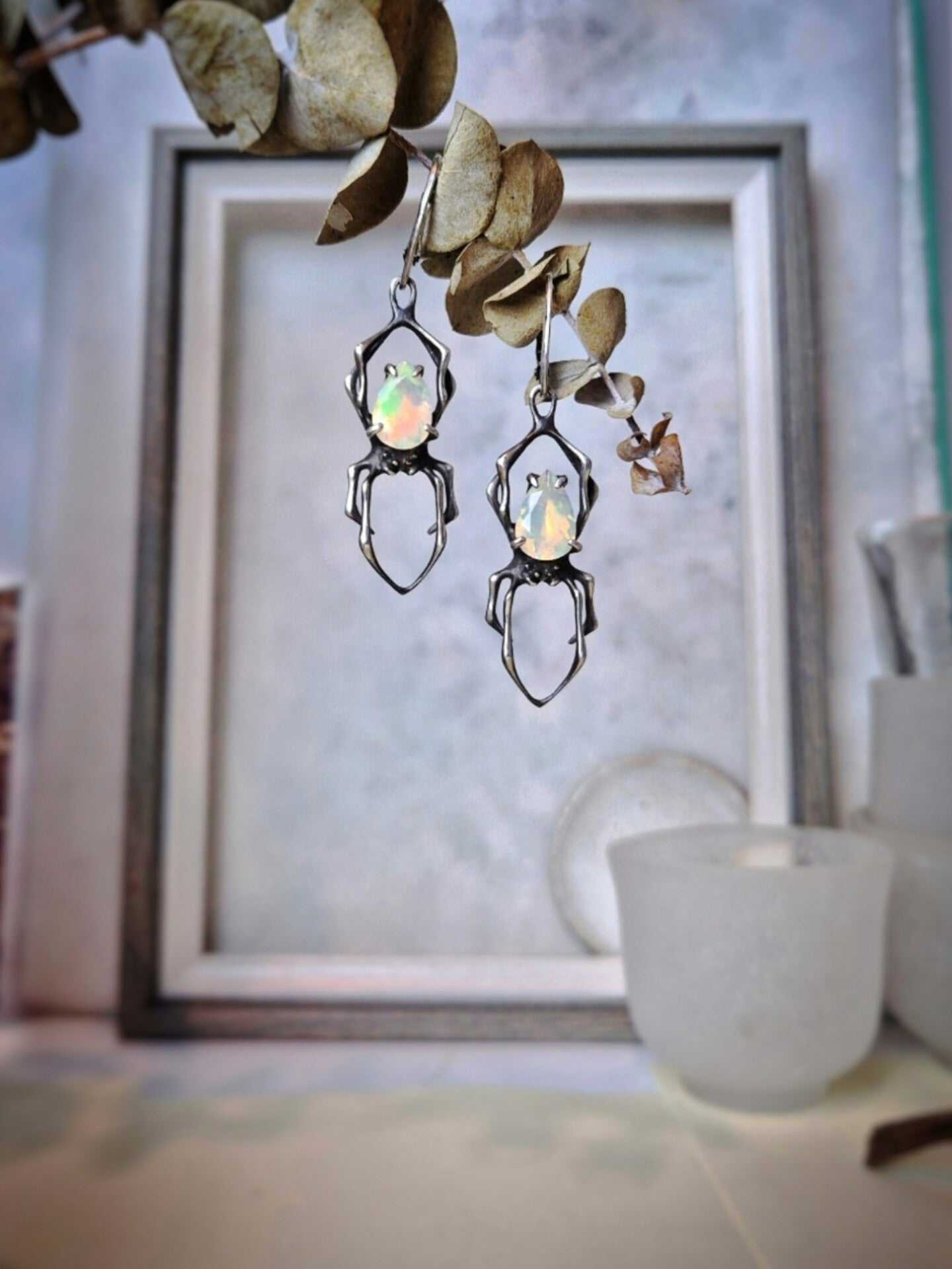 These silver Spider earrings feature natural opals — luminous stones with an foggy white base and flickers of inner fire, glowing with subtle rainbow tones. Natural gemstones vary in shade, but I will select a beautiful gem pair for you - nice and shiny!