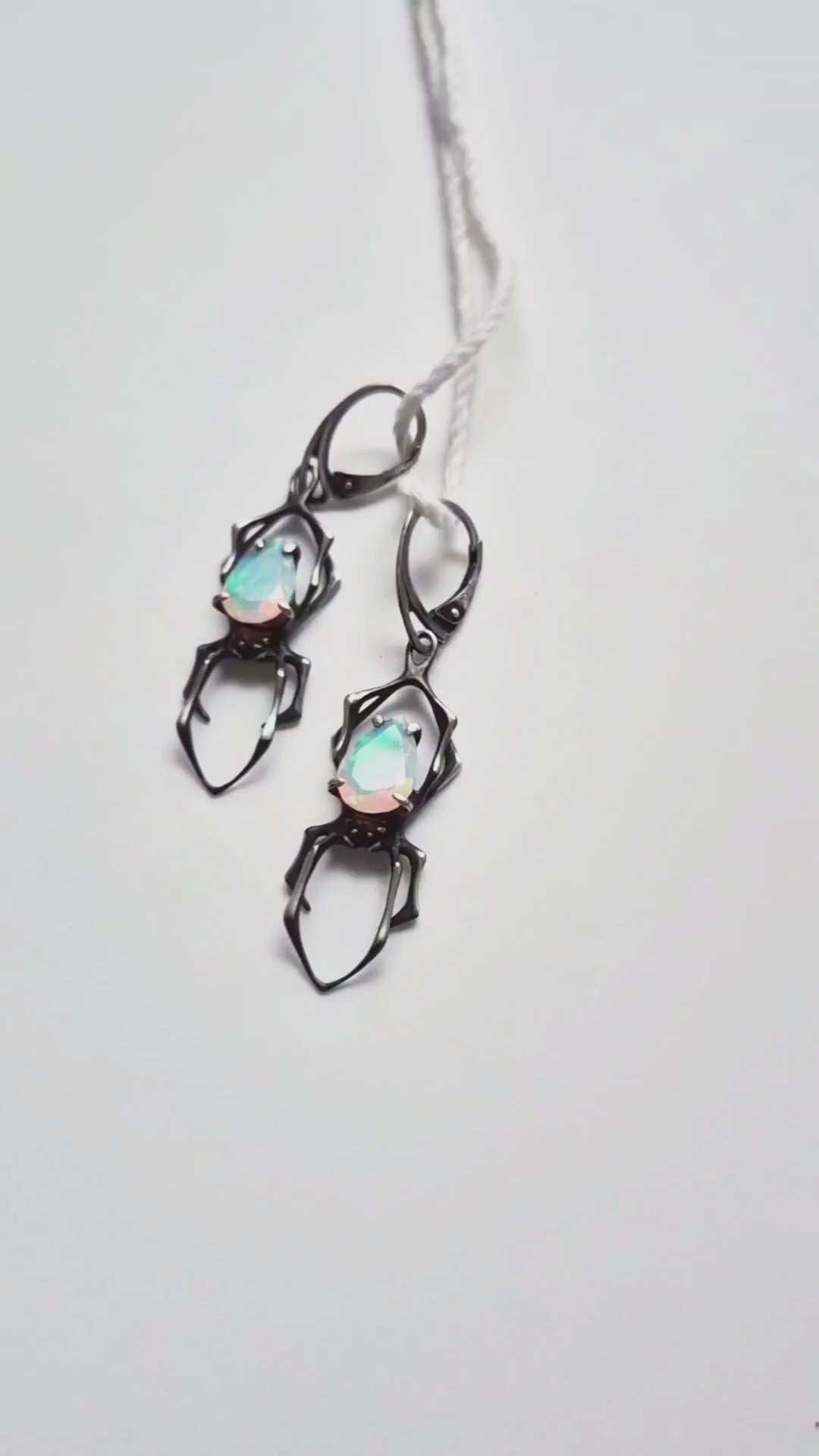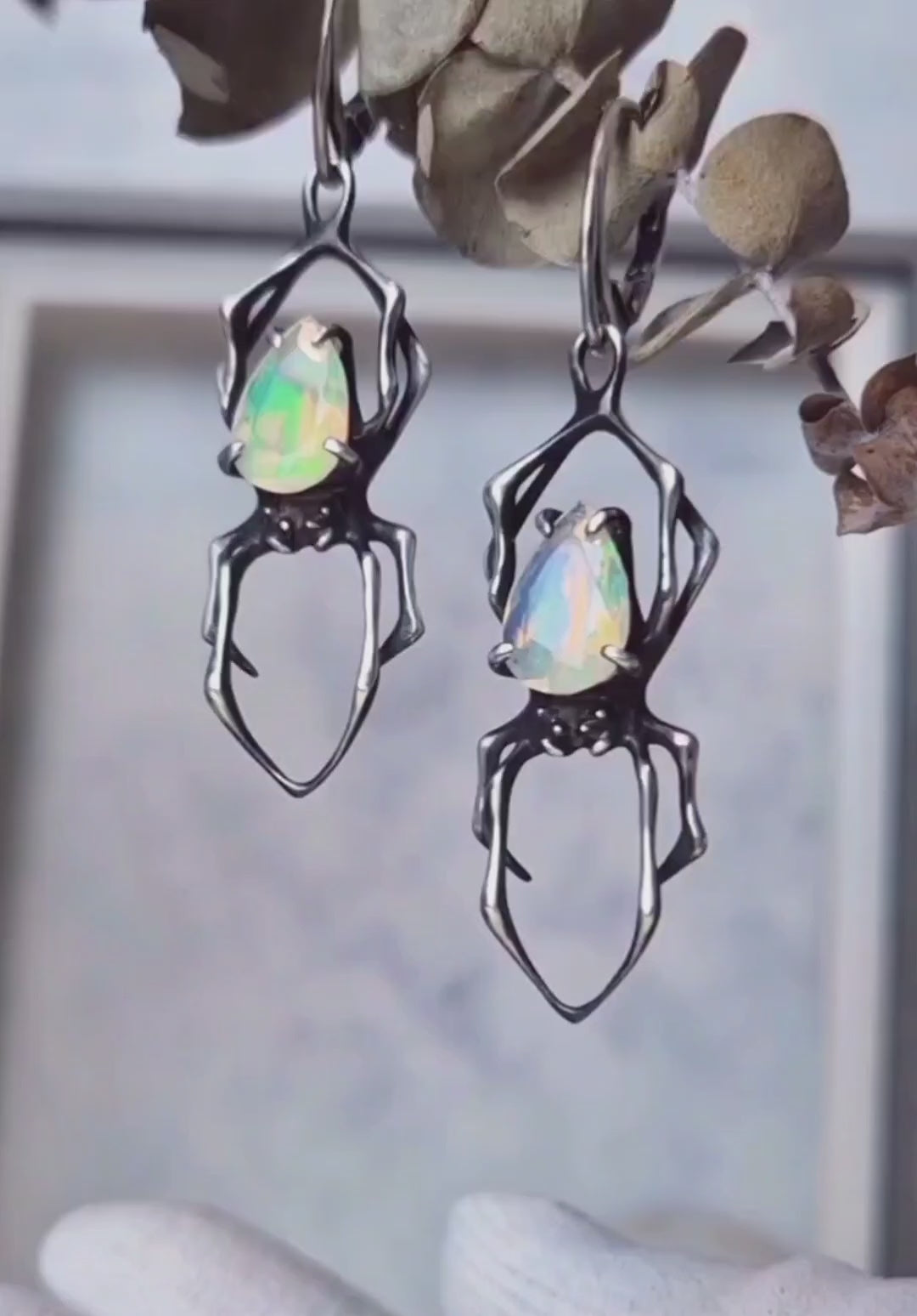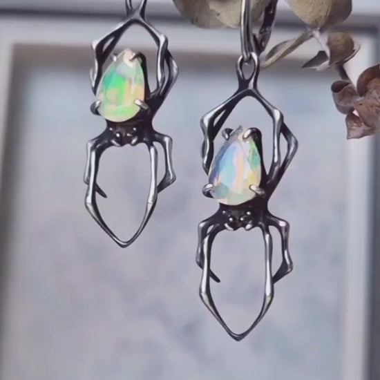 These silver Spider earrings feature natural opals - luminous stones with an foggy white base and colourful flickers of inner fire. Natural gemstones vary in shade, and we will select a beautiful one for you from our curated collection.