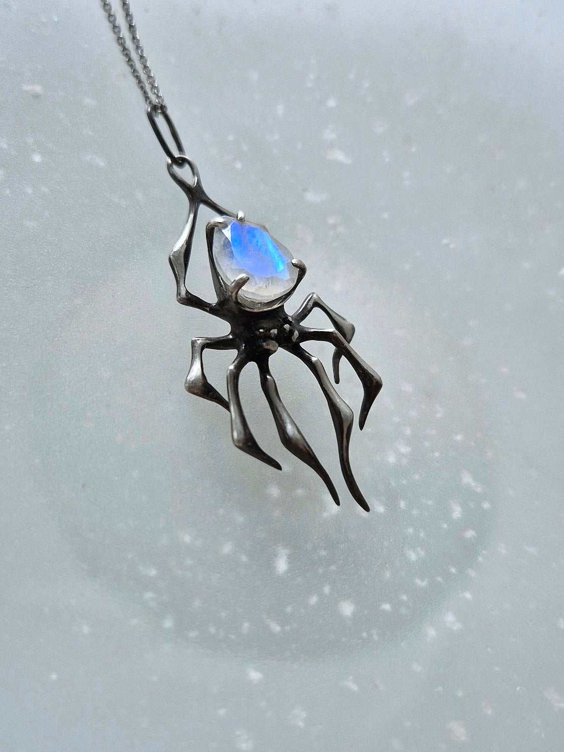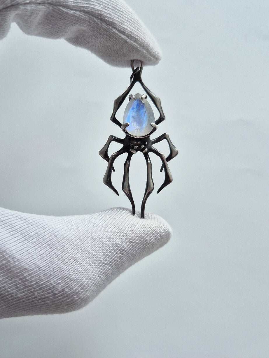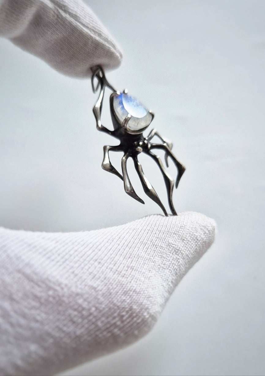 Spider necklace in Sterling silver - Rainbow Moonstone gem - Custom crafted