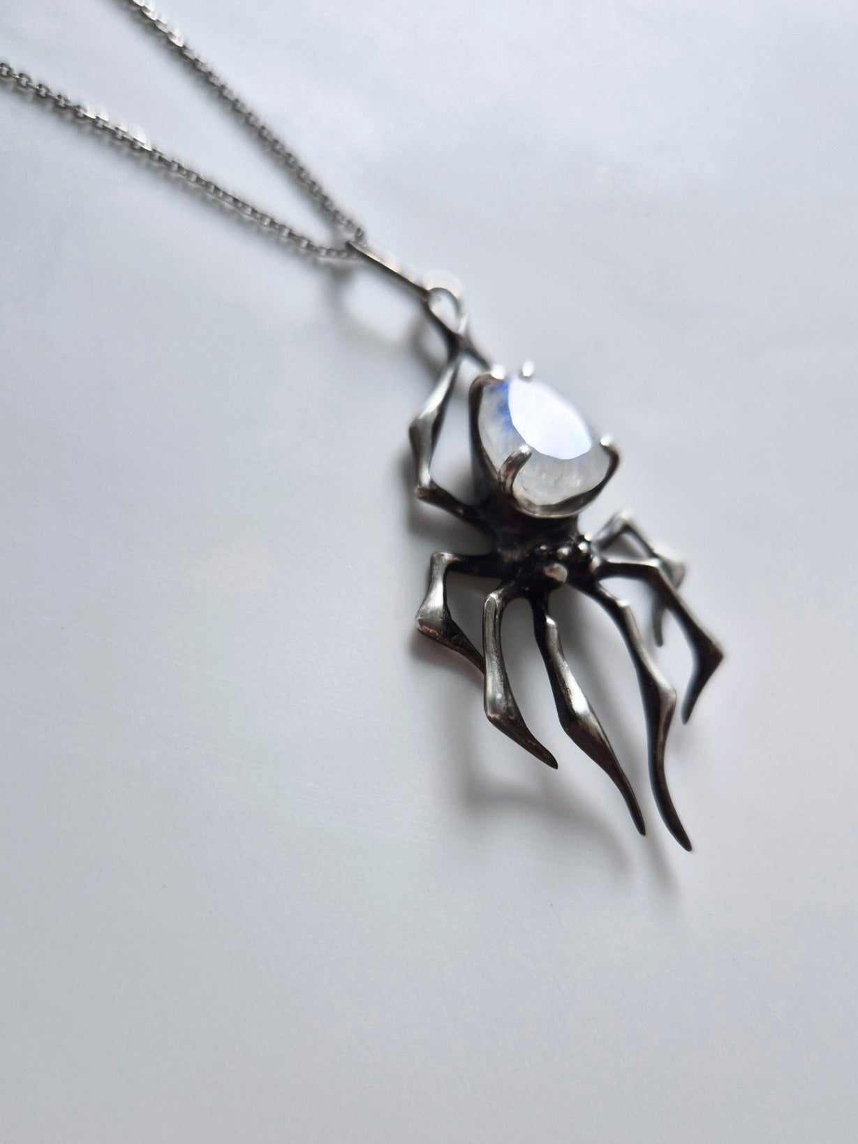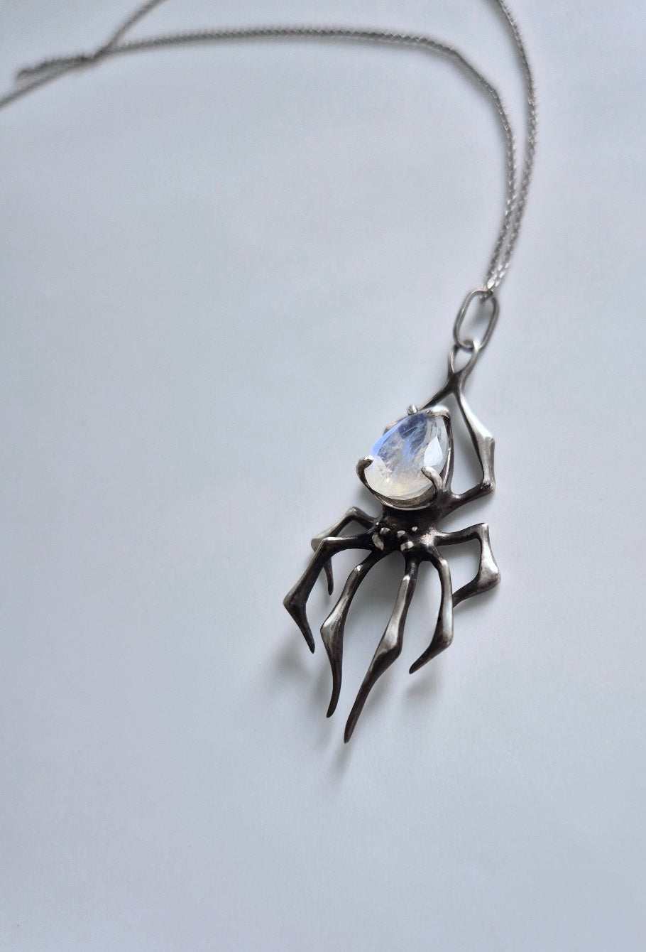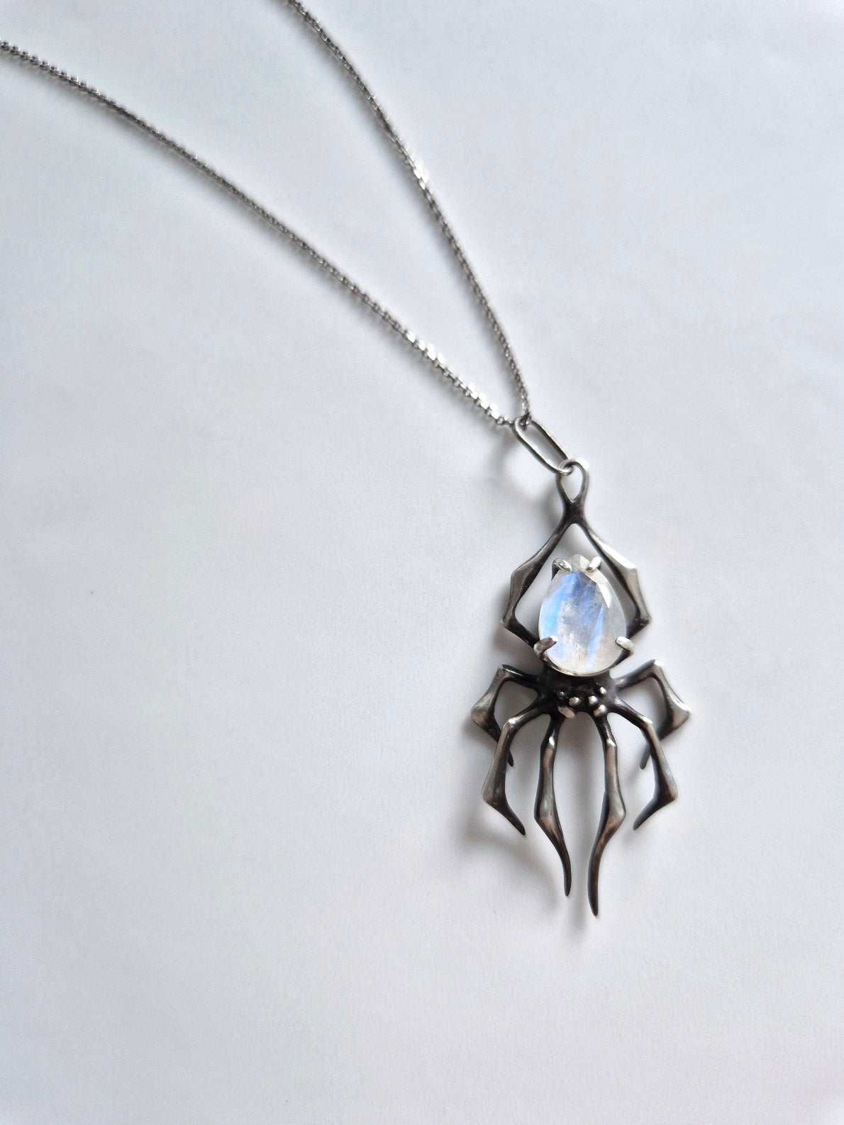 Spider necklace in Sterling silver - Rainbow Moonstone gem - Custom crafted