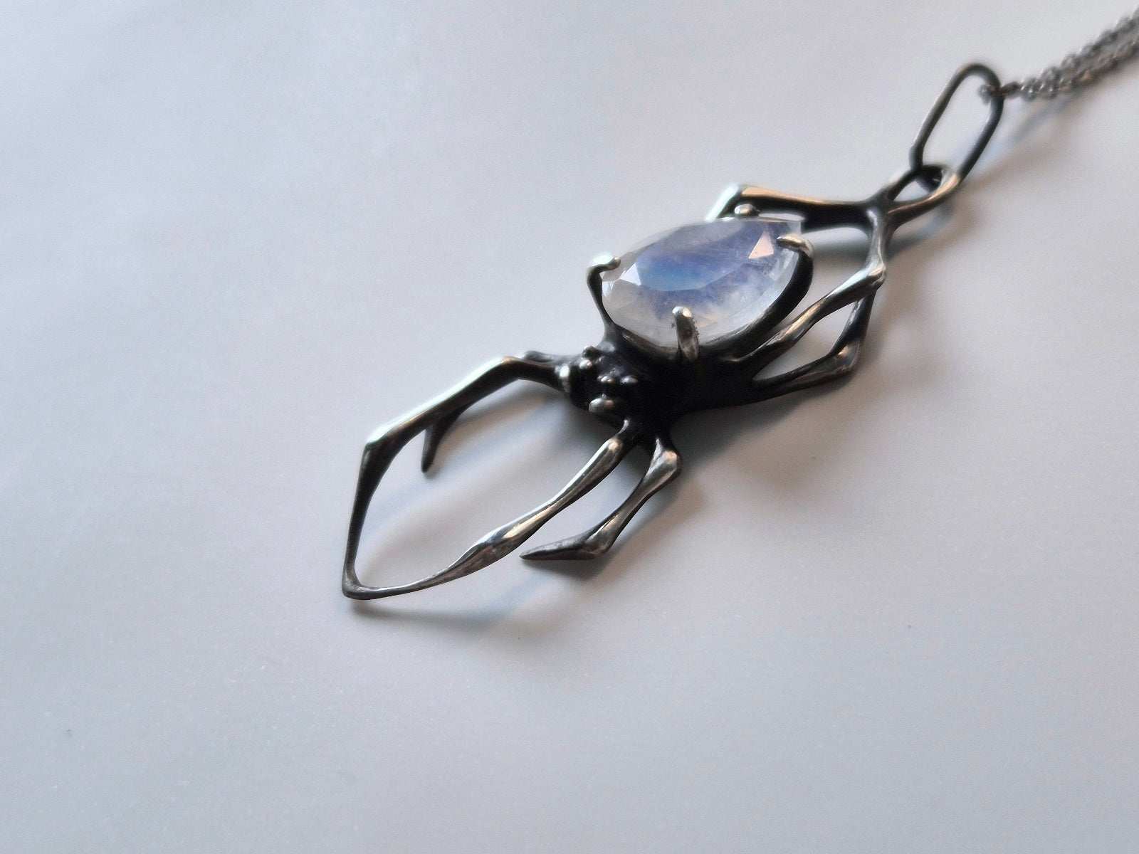 Spider necklace - Rainbow moonstone gem - Handmade oxidized jewelry