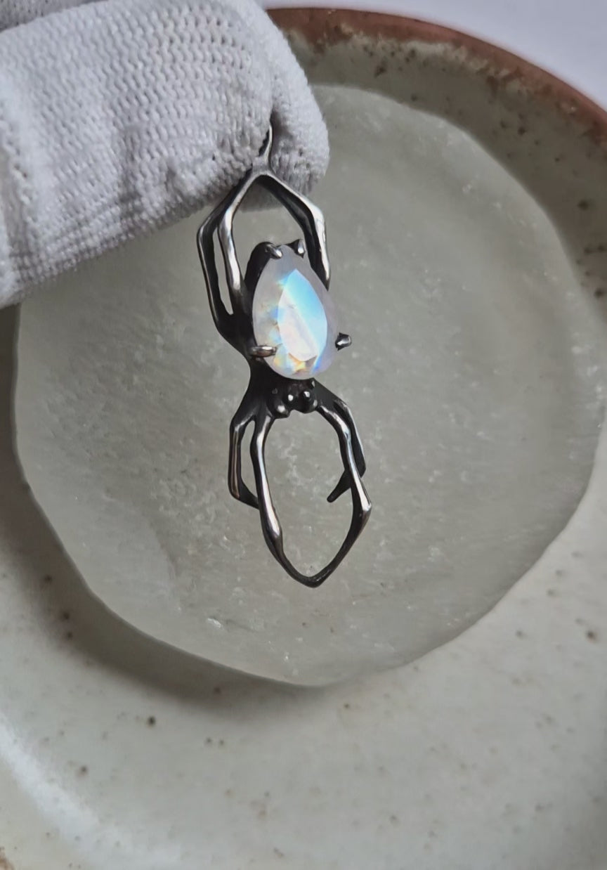 Silver Spider necklace - Rainbow moonstone gem - Handmade oxidized jewelry