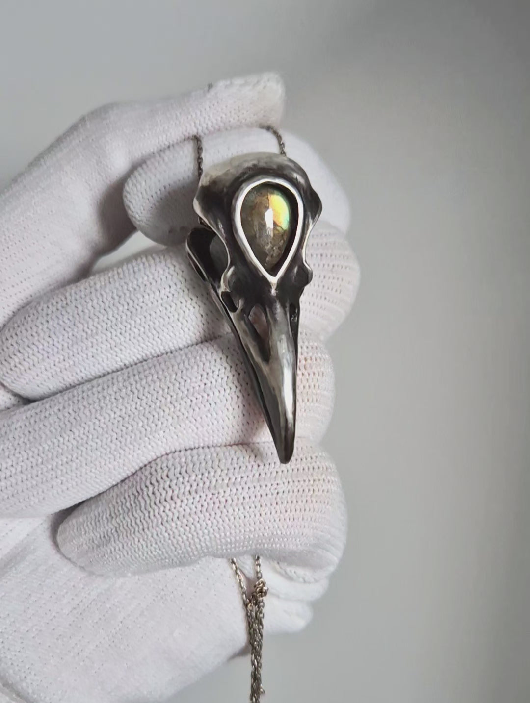 Silver Raven Skull necklace - Labradorite gem - Handmade symbolic silver jewelry